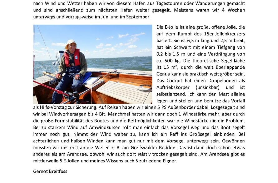 Sie ist für mich ein ungewöhnlich schöner, offener 15qm Jollenkreuzer und damit der perfekte Daysailer. Lässt sich gut „Einhand“ segeln. Ist schnell