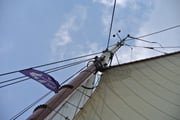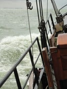 Heute geht es bei 4 Beaufort und Nord-Westwind durchs Wattenmeer nach Makkum. Das Kreuzen forderte die Besatzung bei Arbeiten am flexiblem Rick und Klüver ganz ordentlich. Ein wenig Erleichterung brachte da die Selbstwendefock.