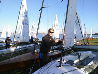 Am Freitag ging es dann um 11:30, bei wiederum herrlichem Wetter, los. Die erste Wettfahrt entpuppte sich als Geduldsprobe. Sehr wenig, dafür aber immer wieder drehender Wind waren eine extreme Herausforderung, wie auch der amtierende Weltmeister im Interview mit dem MDR zugab. Pünktlich zur dritten Wettfahrt setzte der Wind dann völlig aus, so dass der Start abgebrochen werden musste und am Freitag nur zwei Wettfahrten absolviert werden konnten.